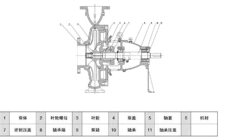 1、卧式后开门结构,泵头与电机采用联轴器连接,安装在底板上,叶轮为后开式,三只轴承,轴封采用外装式机械密封,设有冷却装置,轴承体的油位用油镜观察;结构紧凑合理。