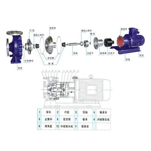 3、冷却润滑液流量的控制泵运作时,需要用少量液体清洗冷却内磁转子与隔离套之间的环隙区域和滑动轴承的摩擦副。冷却液的流量通常为泵设计流量的2-3,内磁转子和隔离套之间的间隙区域由涡流产生高热量。冷却润滑液不足或清洗孔堵塞时,介质温度高于永磁铁的工作温度,内磁转子逐渐失去磁性,磁力传动器失效。介质为水或水基液时,可将间隙区域的温升维持在3~5℃的介质为烃或油时,可将间隙区域的温升维持在5~8℃。